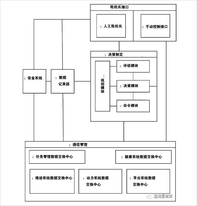 AVEC系统是“人工轮机长”系统的核心,核心功能是决策制定模块,其下包括执行感知功能的评估子模块、执行思考的决策子模块、产生执行命令的命令子模块,以及支撑这三个模块的规划子模块。决策制定模块通过通信管理模块获取各种系统的数据。AVEC系统通过轮机长接口接收输入命令,并保留了手动控制接口,以备特殊情况使用。数据记录器为决策制定模块、通信管理、轮机长接口提供各种事件记录功能;安全系统则截取AVEC内部通信,与数据记录比对,判别是否存在入侵行为。