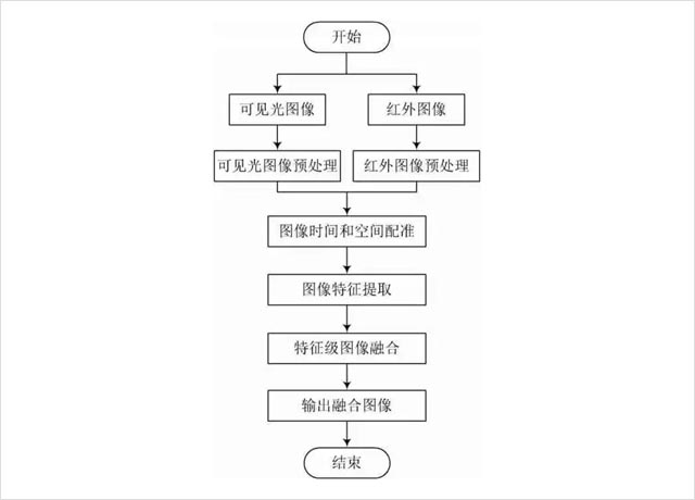 可见光分辨率高、视场大、颜色及特征信息丰富,但抗干扰能力较弱,成像质量受到光照、天气等因素的制约。红外光谱不受光照、烟雾等条件的制约,但成像分辨率低、对比度差、需要增强显示[13]。对于以上两种发展较为成熟的视觉传感器,融合可见光图像和红外图像能够结合两者的优点[14],更易于发现和识别目标。图1为可见光与红外图像融合流程图,算法流程如下: